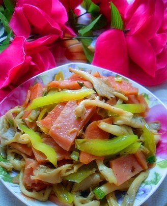 材料:榆黄蘑、火腿50克、柿子椒20克、食盐适量、鸡精适量、生抽适量、蚝油适量
