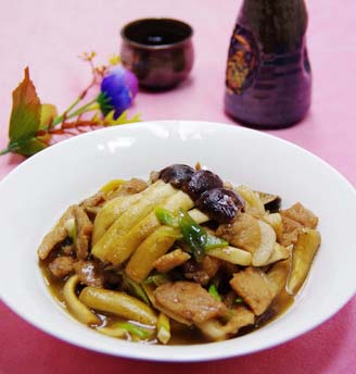 【核心提示】:材料:松茸400克、猪肉100克、葱姜10克、盐2克、生抽15克、清水20克、淀粉10克、白糖3克