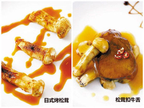 松茸的传统做法是用来炖汤,或者是做刺身,吃原味。不过珠江新城临江大道“福苑酒家”的陈师傅就表示,松茸质地细密,受火后更有口感,和牛肉更是绝配。所以在酒家,松茸有两种做法———“日式烤松茸”和“松茸扣牛舌”。前者借鉴了日本料理的做法,把松茸原条用干棉布擦干净,撒上海盐,烧到9成熟时,再用干葱和姜做成的日本烧汁略烧,吃的是它独特的松木香味。