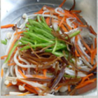 4. 然后放一大勺五仁香辣酱,少许白胡椒粉,白糖,白醋,少许味精和香油拌匀,最后放香菜段拌一下即可