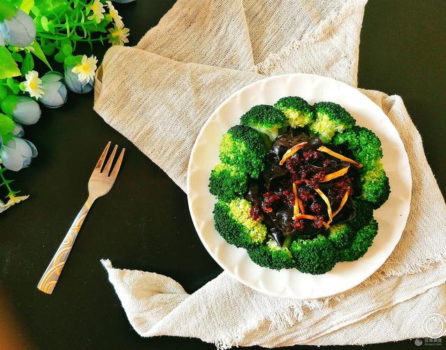 黑木耳 6克、西蓝花 一颗、耗油 1大勺、川婆婆辣肉丝 1勺、姜 2片