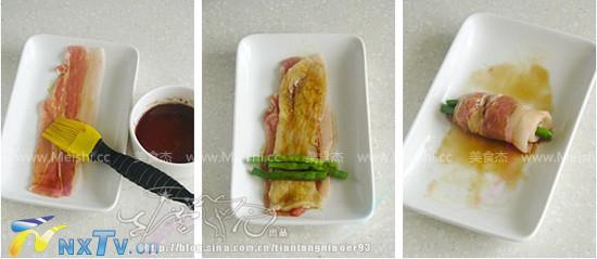 5、将杏鲍菇两面也刷一层酱料,与肉片摞在一些。将豇豆段排在其中一端,刷一层酱料