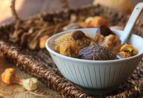 材料(三/四人份):姬松茸10克 香菇10克 茶树菇10克 猴头菇25克 木耳5克 枸杞子5克 排骨/鸡400克