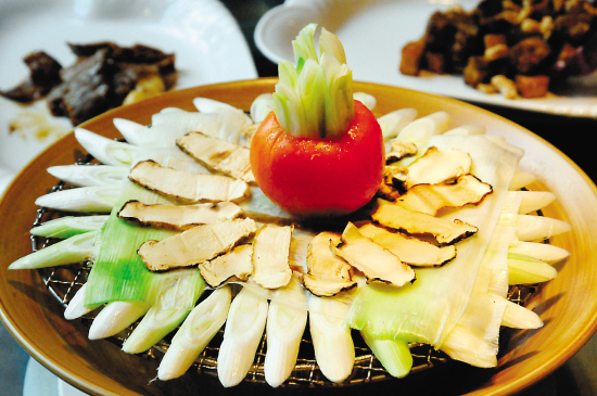 ★炭烧松茸 580元/份 先将大葱平铺在炭炉上,再将切片的松茸放置上面,炭烤过的松茸带着些微的葱香,组合特别。