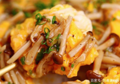 6.出锅装盘,直接将炒好的平菇和蟹味菇放入炒好的鸡蛋饼上面,美味的双菇滑蛋蛋完成
