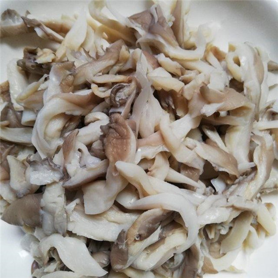 第1步、锅里水烧开,放入平菇,煮出白沫后,再煮一分钟,然后放冷水冲洗后挤干水分备用 。