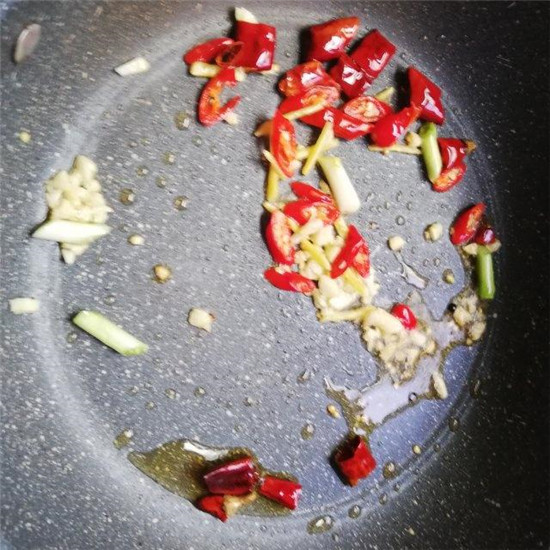 第3步、点火烧锅倒油,油热后加入花椒炸出香味,将花椒挑出扔掉(个人不喜欢将花椒吃到嘴里的感觉),后加入葱白,干辣椒,小米辣,姜,蒜爆香 。