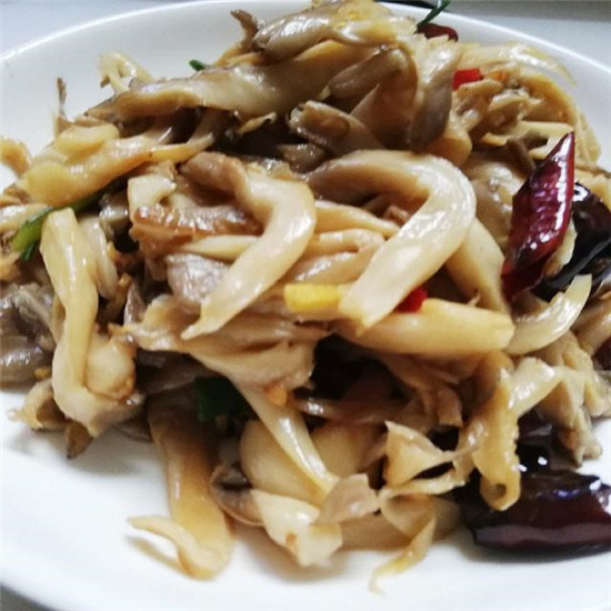 第5步、咸淡合适后,加入葱叶,翻炒后出锅 。一盘下饭的素炒平菇就可以出锅啦 。