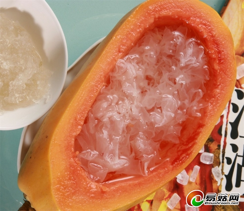 4、发好的燕窝泡热水后,控水,取适量一并倒入木瓜中。