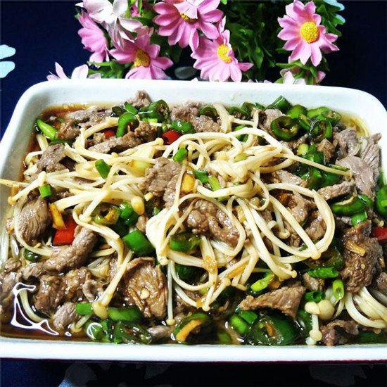 原料:金针菇、鲜牛肉、青椒、葱、酱油、藤椒油、鸡精、淀粉、果酒、盐、白糖、红椒。