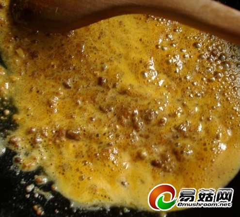 4)等沙茶粉花生酱完全化开后下煸过的杏鲍菇片,开小火翻匀出锅。