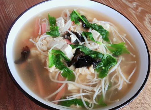 【核心提示】:主要食材: 豆腐,金针菇,火腿肠,木耳 配料: 鸡蛋,芹菜叶子(香菜也可以),盐,淀粉,酱油(可要可不要) 烹饪步骤: 1、