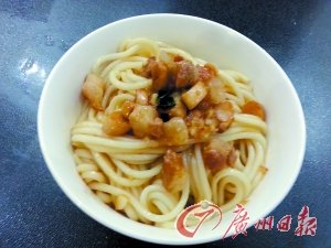 材料:上好的五花肉(半斤)、杂菇(一把,可利用上述菜式中海鲜菇、平菇等的边角料)、鲜面条(约一斤)