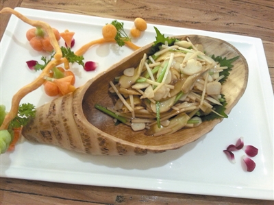 不过赵先生提醒,牛肝菌若烹制不熟或糊锅,可导致中毒,轻则腹泻,重则出现“小人国幻视症”。因此餐厅在烹调中常加入蒜,有着杀毒之功效。“而且作为天然的绿色食材,这种只需要点点的调味料就好。”他同时向读者支招了一道菜“马蹄牛肝菌”:将菌片炒到微微金黄色,然后依次炒蒜片、芹菜段儿、青笋丝和用水焯好的马蹄片,再将菌片回锅炒,点入少许盐、鸡精和美极酱油即可出锅。