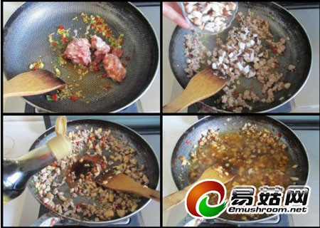 ③先煸香姜葱和辣椒末, 下入肉末煸炒, 肉末煸炒变色后加入香菇一起煸炒, 再加入盐,酱油等调味;