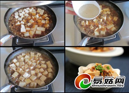 ④加入适量的开水, 煮上一两分钟, 再加入切成小块的豆腐, 一起煮上两分钟,最后加入水淀粉勾起,芡汁浓稠时关火即可,出锅后表面撒些小葱末。