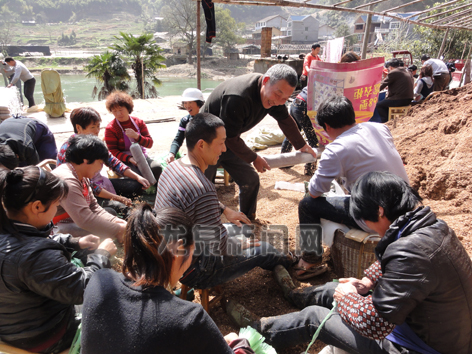 3月24日,龙泉市八都镇安田村广大菇农利用晴好天气纷纷开始制作菌棒,20多个菇农分工协作,装料、捆绑,忙得不亦乐乎,一天下来,能制作1万多袋菌棒。(杨欢婷 摄影)