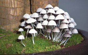 余先生说的这堆小蘑菇,呈白色,像一把把小伞,密密麻麻地出现在花盆中,共有几十棵。有的上面还洒满了可可粉状的细末。