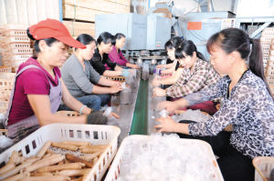 6月1日,在福建省光泽县崇仁乡东盛木制品厂,员工们正在灌装海鲜菇筒。东盛木制品厂原先主要生产木制像框和线条,每年消耗原木近2万立方米。该企业于去年投资1600万元转为工厂化生产海鲜菇,原料主要是从北方购进的棉花籽和玉米粉。据了解,从2008年以来,光泽县共关闭了41家木制品企业,6家竹木制品企业转化种植海鲜菇。(武少龙 高其军 摄)