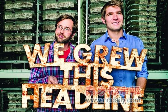 拜尔和他的伙伴麦金泰尔拿着用EcoCradle菌丝泡沫制作的标语“这个标题是我们种出来的。”