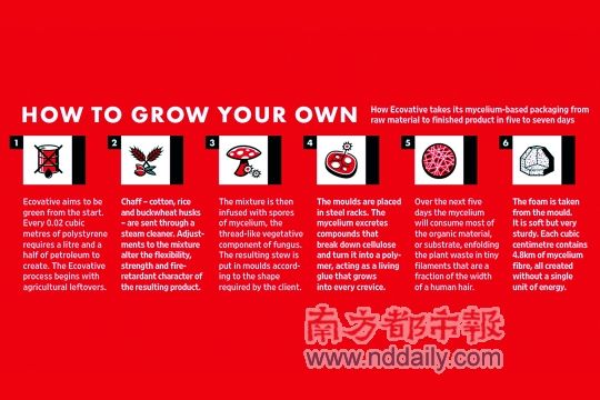 而E covative的生产从农业垃圾开始。拜尔面前的3个巨大不锈钢储料器里面装着轧棉碎屑、稻壳、荞麦壳———作物加工后留下的垃圾。这些稻草色的材料被放到传送带上,经过一个蒸汽净化装置消灭霉菌、细菌和昆虫,然后在与孢子菌丝混合。两名身穿白大褂戴着橡皮手套和无菌帽的女工将混合材料装进塑料模具内。模具的形状格式各样,最后的成品有的用来包装电脑,有的用来包装葡萄酒或是办公家具零件。