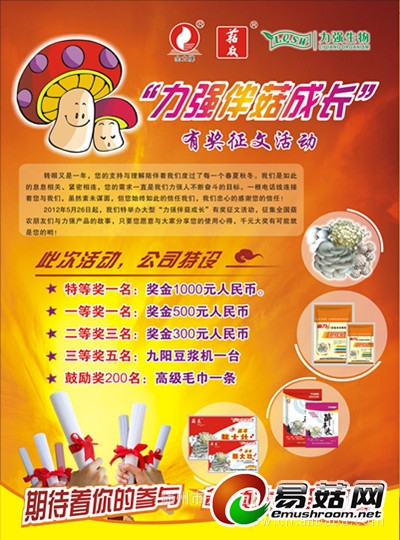 2012年5月26日起,我们特举办大型“力强伴菇成长”有奖征文活动,征集全国菇农朋友们与力强产品的故事,只要您愿意与大家分享您的使用心得,千元大奖有可能就是您的哟!