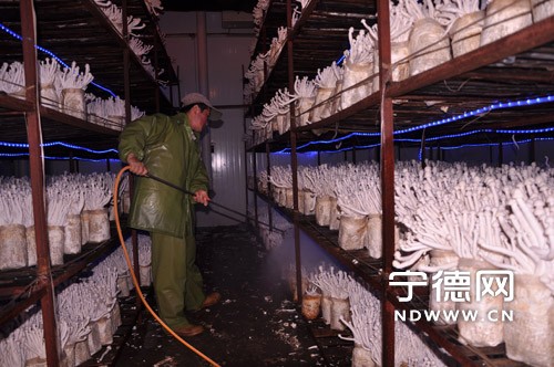 农民专业合作社的菇房内,工人正在给海鲜菇喷水。据了解,每年的3至6月份是海鲜菇的价格低谷期。目前,海鲜菇鲜品的价格已由之前的8元/公斤回升到了14元/公斤。随着价格的回升,古田的海鲜菇生产企业已逐渐开始上足马力抓紧生产,努力提高北京、上海、广州、成都等地市场的供货能力。
