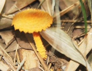 红鳞花边伞:全身呈橙红色,菌盖周围呈鱼鳞形伞状。有大毒,幼时长这样,等成熟后变污白至浅褐色,菌肉较薄。若误食,会引起胃肠炎型中毒。