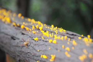 随后,记者又来到大明寺的后花园,在一段枯木上,长满了金黄色小“蘑菇”(之所以把蘑菇加上引号,因为经专家鉴定,这是木耳一类),非常漂亮。