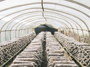 大棚里摆满培育人工菌的菌棒。