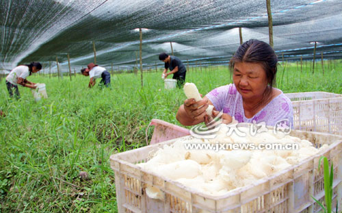 基地,农民正在采摘竹荪。该县自去年起引进竹荪种植以来,面积已达500多亩,目前,每亩收入达八九千元。