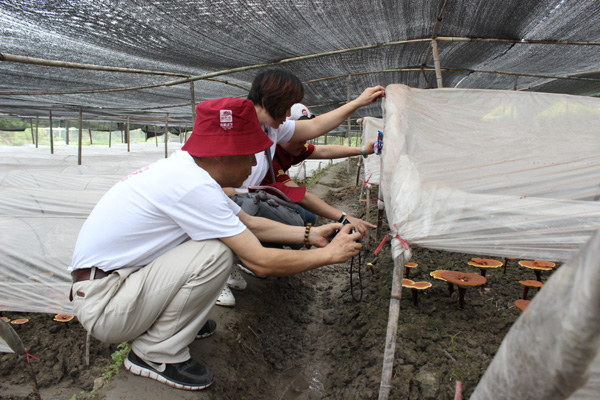 7月,正是原木有机灵芝生产的时期,会员朋友们亲眼见到有机灵芝基地中一朵朵刚抽出嫩黄幼茸的灵芝,展开了稚嫩的伞盖,颜色是极美的。 在激动的同时,会员朋友不忘对灵芝栽培的环境、原料、生长周期提出各种问题。灵芝的生长条件极为苛刻,武夷山脉的温度、湿度都非常适合灵芝生长,仙芝楼公司在这里建立有机灵芝种植基地,以直径30cm的椴木为培养基,以天地为培养道场,严格控制了土壤、水源的纯净度,才能培植出纯正、高效的有机灵芝,保证灵芝深加工产品原料质量。