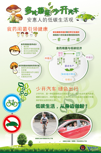 海报以“多吃蘑菇,少开汽车”为主题,向人们诠释了食药用菌(俗称:小蘑菇)的营业价值及其低碳循环经济的发展形态;与此同时,也以“少开汽车”作为人们绿色出行的方式提出呼吁,希望人们以自己的实际行动来积极履行环境保护的社会责任。