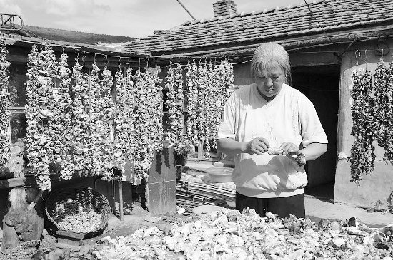 8月27日,阿尔山市白狼镇林俗村梁凤英大娘正在晾晒蘑菇。据了解,因为野生蘑菇大丰收,今年白狼镇全镇采摘野生蘑菇的收入达到百余万元。