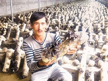 买买提·麦提萨迪尔(音)展示他种的木耳。高羽摄