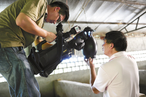 央视记者在温岭坞根老区杨兴富的种猪养殖场采访,了解灭蚊器使用效果。金宗炳摄