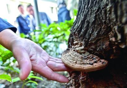 说起这两朵菌类植物,也是高先生无意中发现的,早在去年年初,高先生看到树干上有个一元硬币大小的菌类,于是好奇地拔下来了,可是因为搞不清这小东西的身份,就被他“雪藏”了。不料今年4月,高先生发现原地又冒东西出来了。他不动声色,希望它能长大成形,好做判断。直到现在,这两朵菌类植物已有6个多月了。“摸上去是硬的,不会是灵芝吧?”高先生这样猜测,也希望有人能帮忙鉴定真身。
