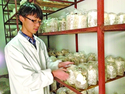 崔杨网是江苏农林生物工程系大三的学生,学校位于句容市。现在这个时候当地白天差不多维持在常温,昼夜温差也不太大,正是种蘑菇的好时节。小崔告诉记者,真正喜欢上蘑菇还是源于自己第一次亲手种蘑菇。“大一的时候大多是理论课,对蘑菇虽然有接触,不过不多。当时有一次实践是种金针菇,当时特别激动,接种后我几乎每隔一两天都要去库房看一下菌包有什么变化。当看到白白的小蘑菇一点一点地从袋子里面长出来再慢慢长大,觉得特别神奇,特别有成就感。”