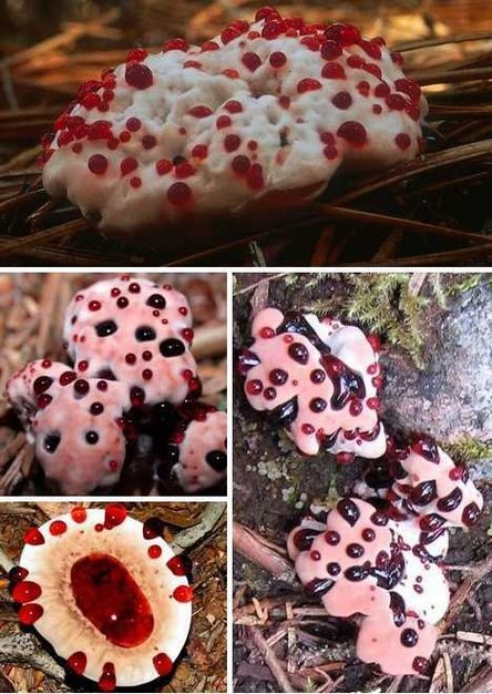 血牙蘑菇的学名是Hydnellum pecki,通常生长在太平洋西北部和欧洲中部地区的松树林中,韩国人和伊朗人对这种蘑菇物种十分关注。毕竟这种蘑菇长着奇特的外形,像血液一样的亮红色液体从蘑菇表面渗了出来,会让人不由得联想到这是否曾有动物流血,或者是某个犯罪现场。