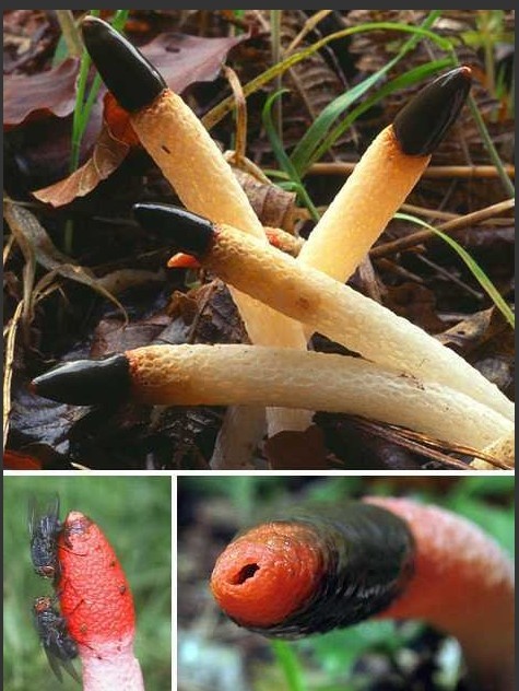 狗蛇头蘑菇的拉丁文名称是蛇头菌属,这种长茎干状蘑菇携带着一个粘性孢头,可以吸引昆虫,散发着猫类粪便的气味。