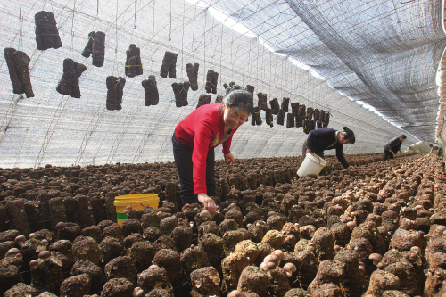 菇农正在采摘蘑菇。(资料照片)记者 李亮 摄