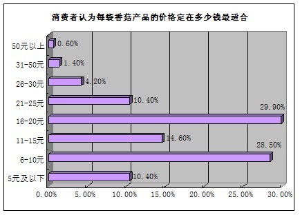 调查结果显示,认为每袋香菇产品的价格定在16-20元最适合的消费者选择比率排在首位,占29.9%;其次是回答每袋香菇产品的价格定在6-10元最适合的消费者比率占28.5%;排在第三位的是认为每袋香菇产品的价格定在11-15元最适合的消费者比率占14.6%;同时分别有10.4%的消费者认为每袋香菇产品的价格定在21-25元和5元及以下最适合;认为每袋香菇产品的价格定在26元以上最适合的消费者比率合计只有6.2%。香菇产品不是简单地根据包装容量决定产品的价格,而是根据消费者的价格需求来决定产品的包装容量。从以上调研分析图表中不难看出,每袋香菇产品价格定在6-25元之间消费者认为是更适合的。