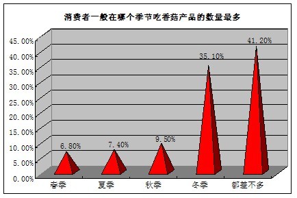 在春夏秋冬四个季节中,消费者在冬季吃香菇产品的数量总体上要多于其它三个季节。回答在冬季吃香菇产品数量最多的消费者比率占35.1%;表示在秋季、夏季和春季吃香菇产品数量最多的消费者比率分别为9.5%、7.4%和6.8%;回答春夏秋冬四个季节吃香菇产品数量差不多的消费者比率占41.2%。可见,香菇产品也存在一定的季节消费差异,消费者在冬季吃香菇产品的数量更多。