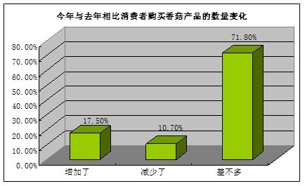今年与去年相比表示购买香菇产品数量增加了的消费者比率占17.5%;回答今年购买香菇产品的数量比去年减少了的消费者比率占10.7%;有71.8%的消费者表示今年购买香菇产品的数量与去年相比差不多。从该项调研结果可以看出,近两年袋装香菇产品的消费量呈明显上升趋势。