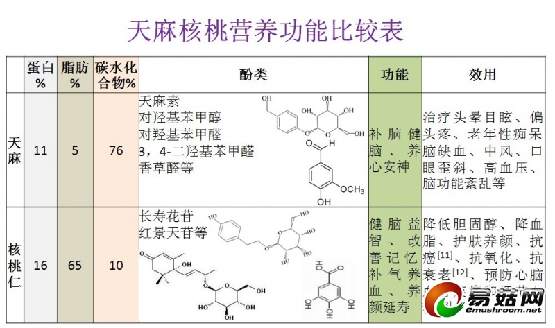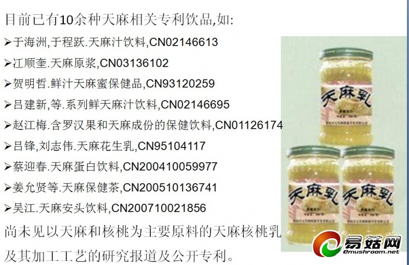 11月12日,2012年首届全国天麻会议在湖北宜昌召开,昆明理工大学陈朝银教授作了《天麻核桃乳的研制及体系稳定性研究》的报告,报告中提到以昭通天麻和核桃仁为主要原料经磨浆、均质乳化、高温灭菌等加工工艺制备天麻核桃乳,并研究复合乳化稳定剂对天麻核桃乳体系稳定性的影响。结果表明:鲜天麻5%,核桃仁5%,蔗糖7%的配比条件下,所制备的天麻核桃乳具有典型的感官特性;复合乳化稳定剂可使提高乳化稳定性。结论:以天麻、核桃仁、蔗糖、复合乳化稳定剂为原料,经磨浆、均质乳化、高温灭菌等加工工艺可制备得到营养和色香味形俱佳、质感稳定的天麻核桃乳。