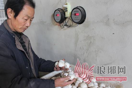 当地菇农在检验双孢菇质量,科学调整湿度、温度。
