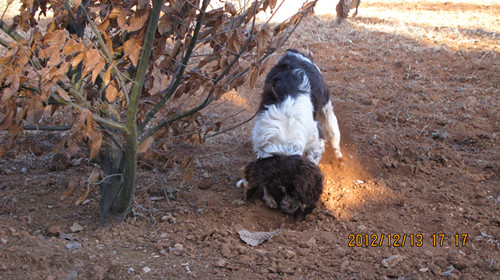 中国科学院昆明植物研究所高等真菌系统与资源研究组,在刘培贵研究员的带领下,十年来聚焦国产块菌属真菌的系统与资源多样性研究,在摸索菌根合成条件和机制方面进行了大量的考察及研究工作,积累了第一手资料和丰富经验,在国内率先采用自创的菌根合成技术成功地培育了块菌与华山松、云南松、板栗菌根树苗,并获得了国家发明授权专利。自2008年以来分别在云南丽江永胜、玉溪易门、昆明官渡区方旺林场、西山区团结乡、昆明盘龙区上游库区、文山石漠化地区建立了种植示范试验基地。研究工作得到一些媒体的关注,继CCTV 10科教频道《关注松露》特别节目报道之后,几年来CCTV 7频道科技苑栏目组追踪采访,于2012年12月13日在刘培贵研究员研究组及其客座研究员王云教授的陪同下一同前往昆明西山区团结乡块菌种植示范试验基地检测菌根生长状况,在公安部昆明警犬基地块菌狗的帮助下,首次发现了2枚块菌子实体(如上图)。该块菌种植示范试验基地建立于2008年4月11-14日,采取印度块菌分别感染华山松(150株)、板栗(126株)合成的块菌树苗移栽种植,占地约10亩,经过四年多的管理和培育,产出了由人工合成块菌菌根苗培育出的第一批印度块菌子实体,表明由我们自己创制的人工合成块菌菌根苗的技术能够培育出块菌来,为我国人工块菌种植园的建设开启了大门!