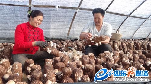 开始陆续采摘上市,预计收入可达4万元。来自浙江丽水的潘和胜夫妇来如东掘港镇港南村种植香菇已有9年,种植的香菇全部销往天一农贸批发市场,为县城居民蔬菜供应提供保障。图为夫妇俩正在菌棒上采摘香菇。