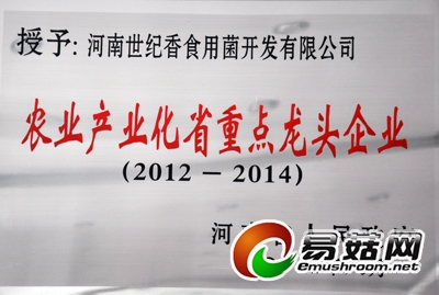 2012年9月由国家农业部农产品加工局组织的2012年全国农产品加工投资贸易洽谈会在驻马店点举行,该公司生产的“世纪香”牌白灵菇罐头被评为“2012年农产品加工业投资贸易洽谈会优质产品奖”。