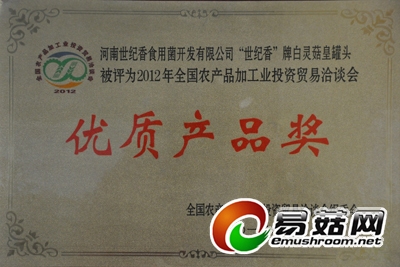 2012年11月举行的中国郑州农产品加工博览会对参展企业要求评奖的粮油、禽畜、水产、果蔬等4大类138种农产品进行了综合审评,该公司“世纪香”牌白灵菇罐头荣获“优质产品奖”。